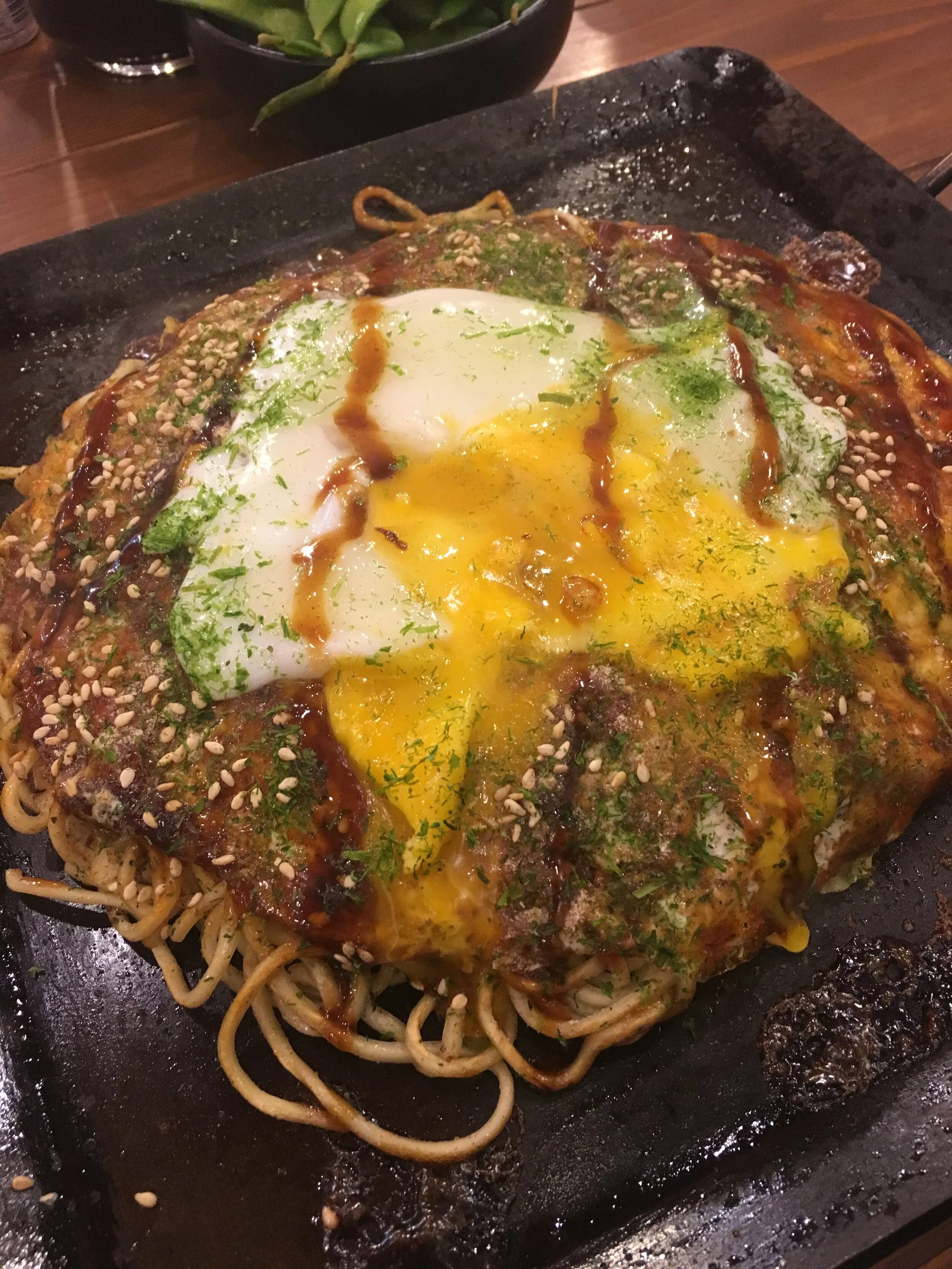 Night one’s late flight arrival forced us (albeit hardly kicking and screaming) into enjoying the local version of Okonomiyaki, where cabbage is king and piled high with all the other traditional gubbins. Although this doesn’t render the dish anywhere close to healthy, it is of course naughtily delicious.